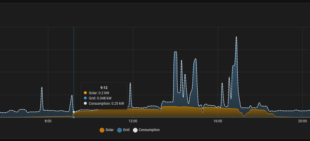 Dzięki integracji z Home Assistant, inwerter pracuje inteligentnie. Na przykład o godzinie 10:00, gdy panel zachodni jest jeszcze w cieniu, mechanizm Zero Export ogranicza moc mikroinwertera (np. do 45%), byle tylko pokryć aktualne zużycie domu.