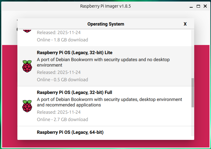i wybieramy RaspberryPi OS ( Legacy, 32bit) LITE BOOKWORM - wersja LITE nie posiada pulpitu i jest idealna i sprawdzona do tego rozwiązania