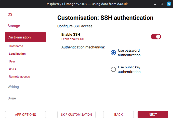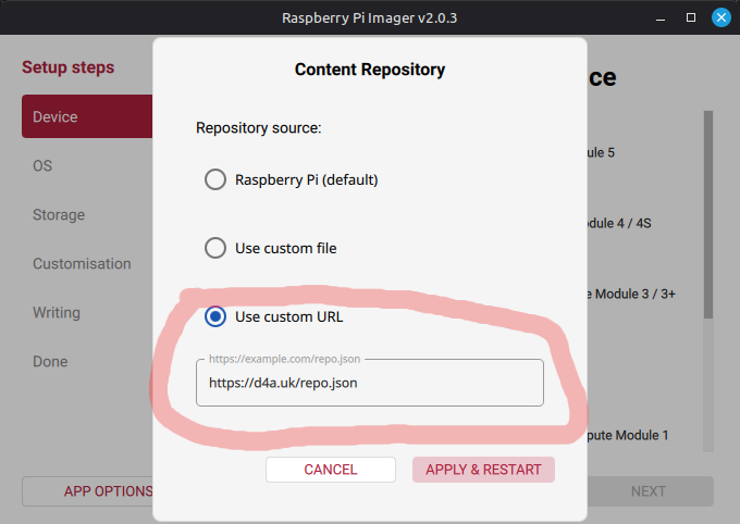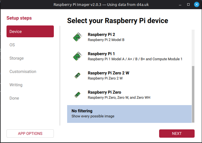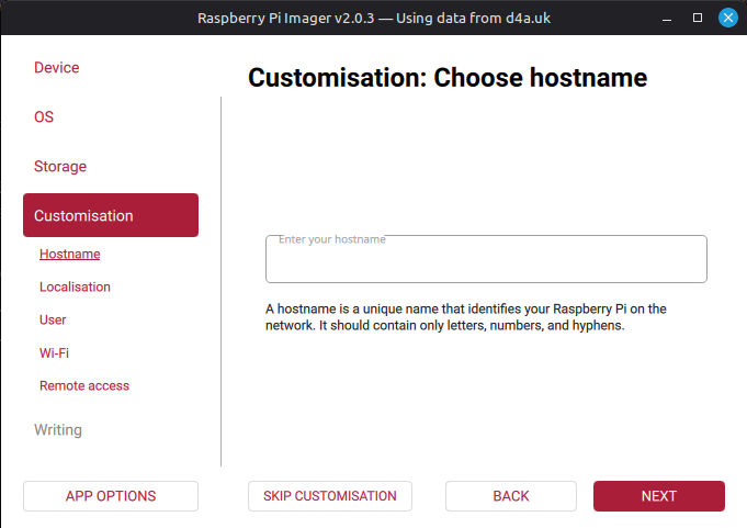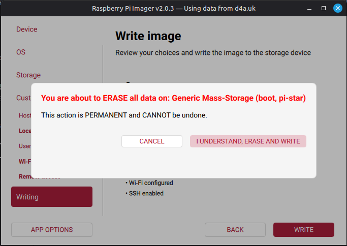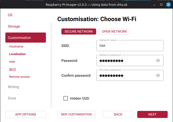 Imager jako narzędzie do "wypalania" obrazów na urządzenia RaspberryPi w wersji 2.0 i nowszej trochę się zmienił i zabrakło w nim kilku funkcjonalności które sa kluczowe podczas wgrywania obrazów osób trzecich. Zabrakło możliwości personalizowania obrazu, która głownie ograniczała do podania naszej lokalnej sieci WiFi.
