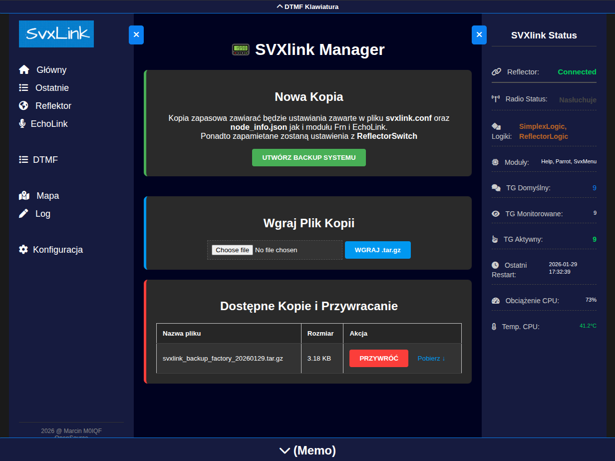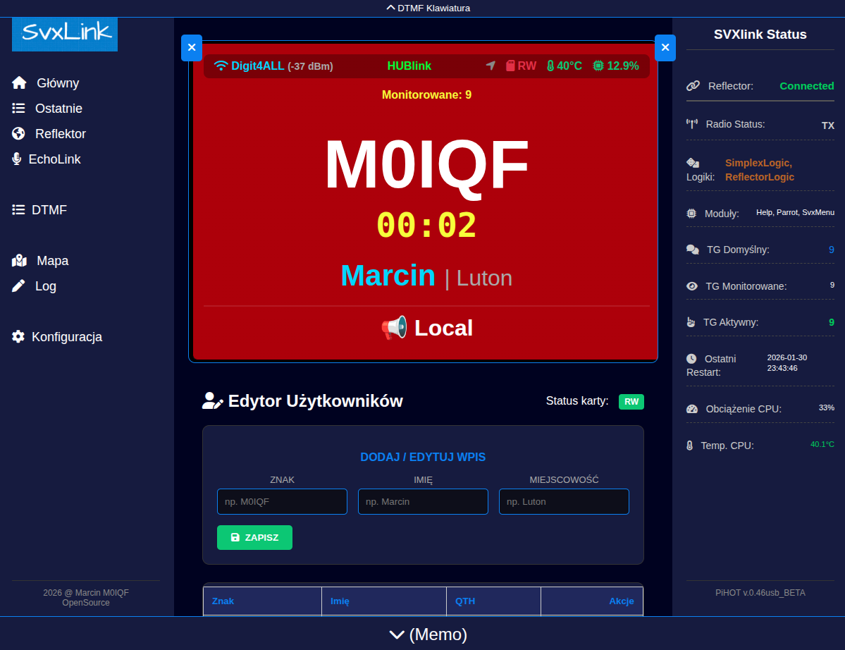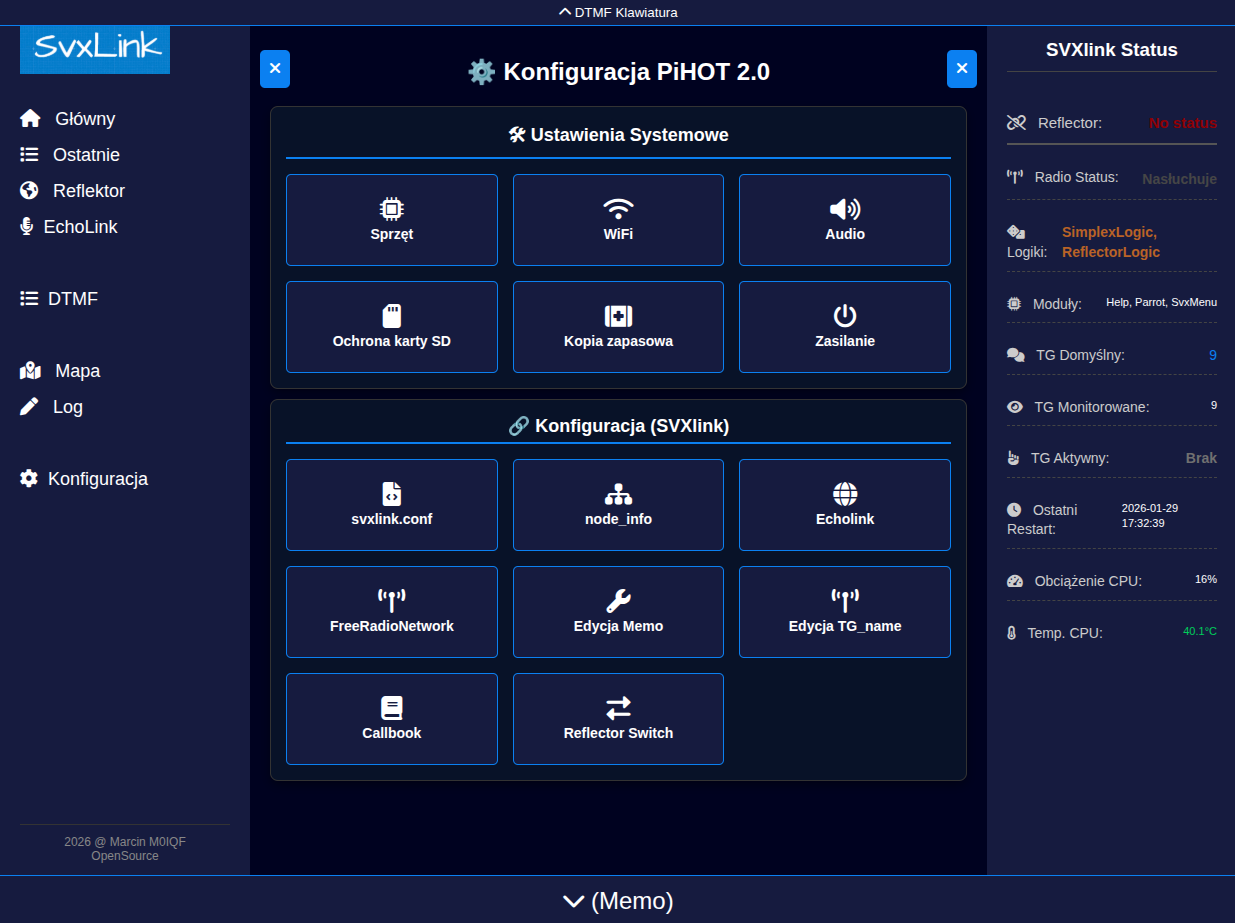 Projekt ten w założeniu miał być prostym i lekkim dashboardem, ale ostatecznie urósł do roli kompletnej "bazy" (obrazu systemu) dla hotspotów FM na bazie RaspberryPi - a za fakt że się to tak rozrosło moge podziękować SierraEcho Team którzy byli jednymi z pierwszych BETA-testerów i dzielili sie uwagami odnośnie tej mojej "cegiełki" na dobry poczatek i start sieci SQlink.