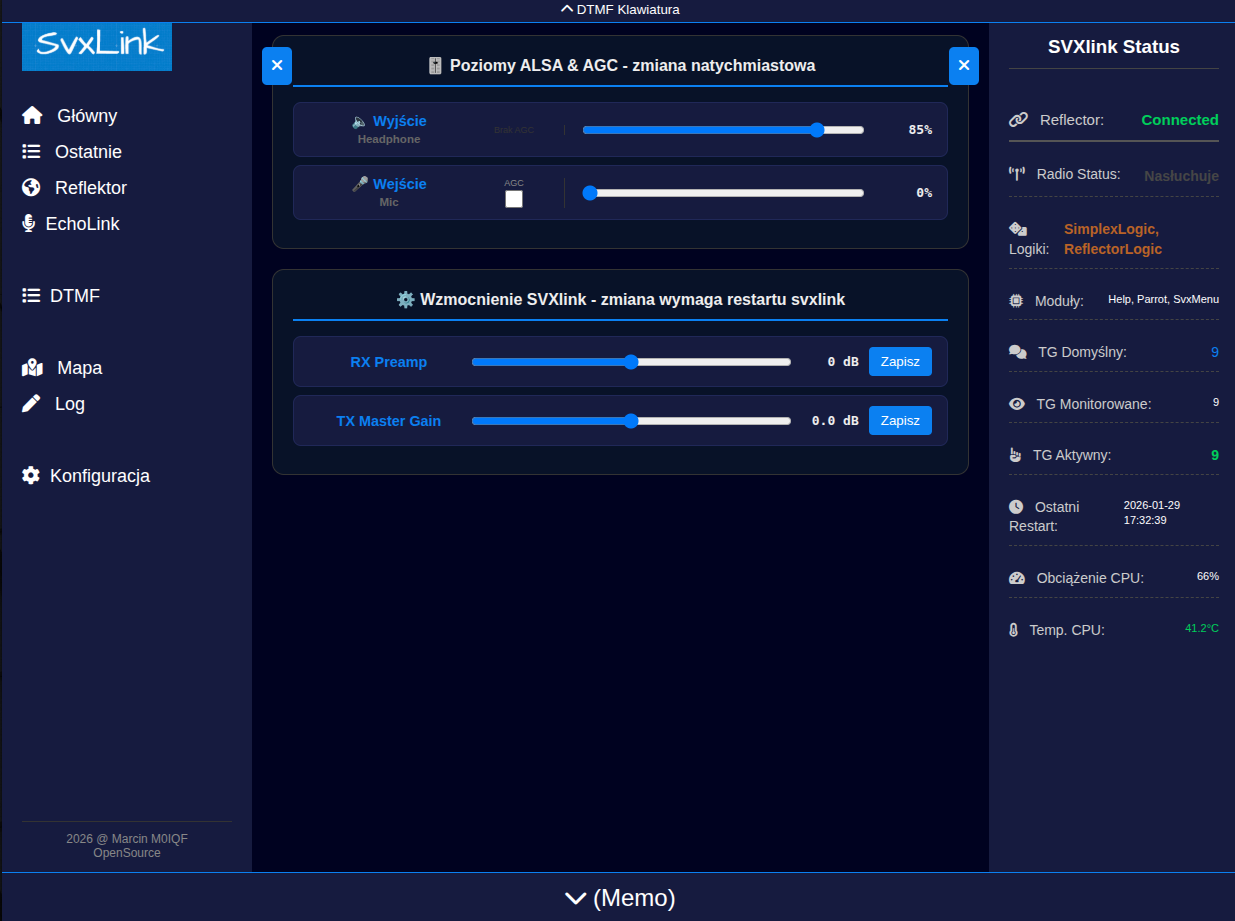 Kolejnym krokiem zapewne będzie konieczność ustawienia poziomów audio. I tu mamy suwaki pozwalające na płynną korektę zarówno karty dźwiekowej jak i wzmocnienia z poziomu programu SVXlink. Docelowo kiedyś tu się znajda także filtry audio.