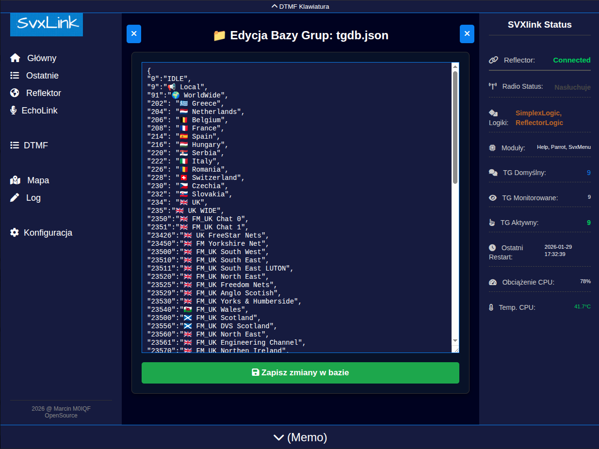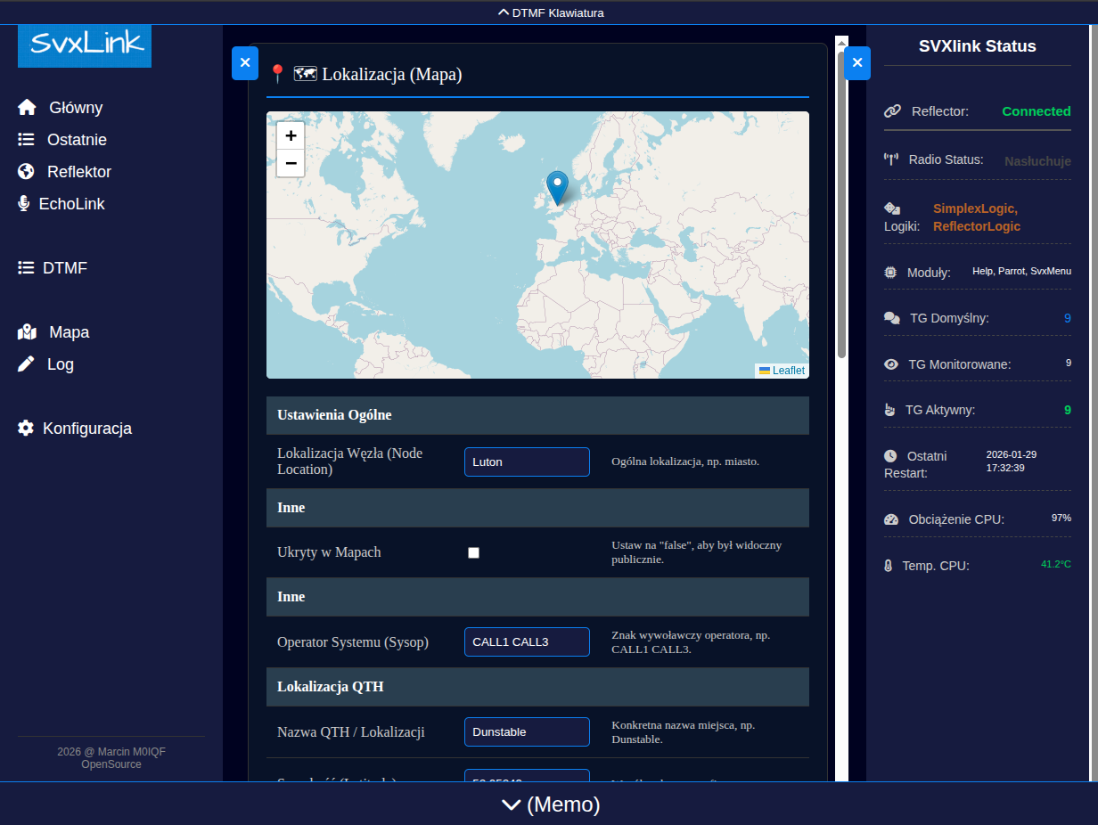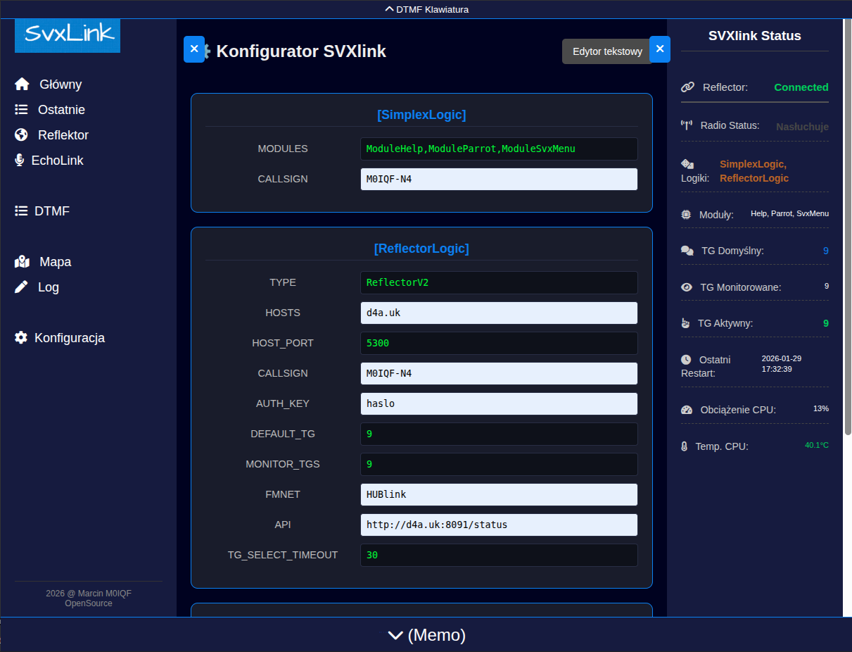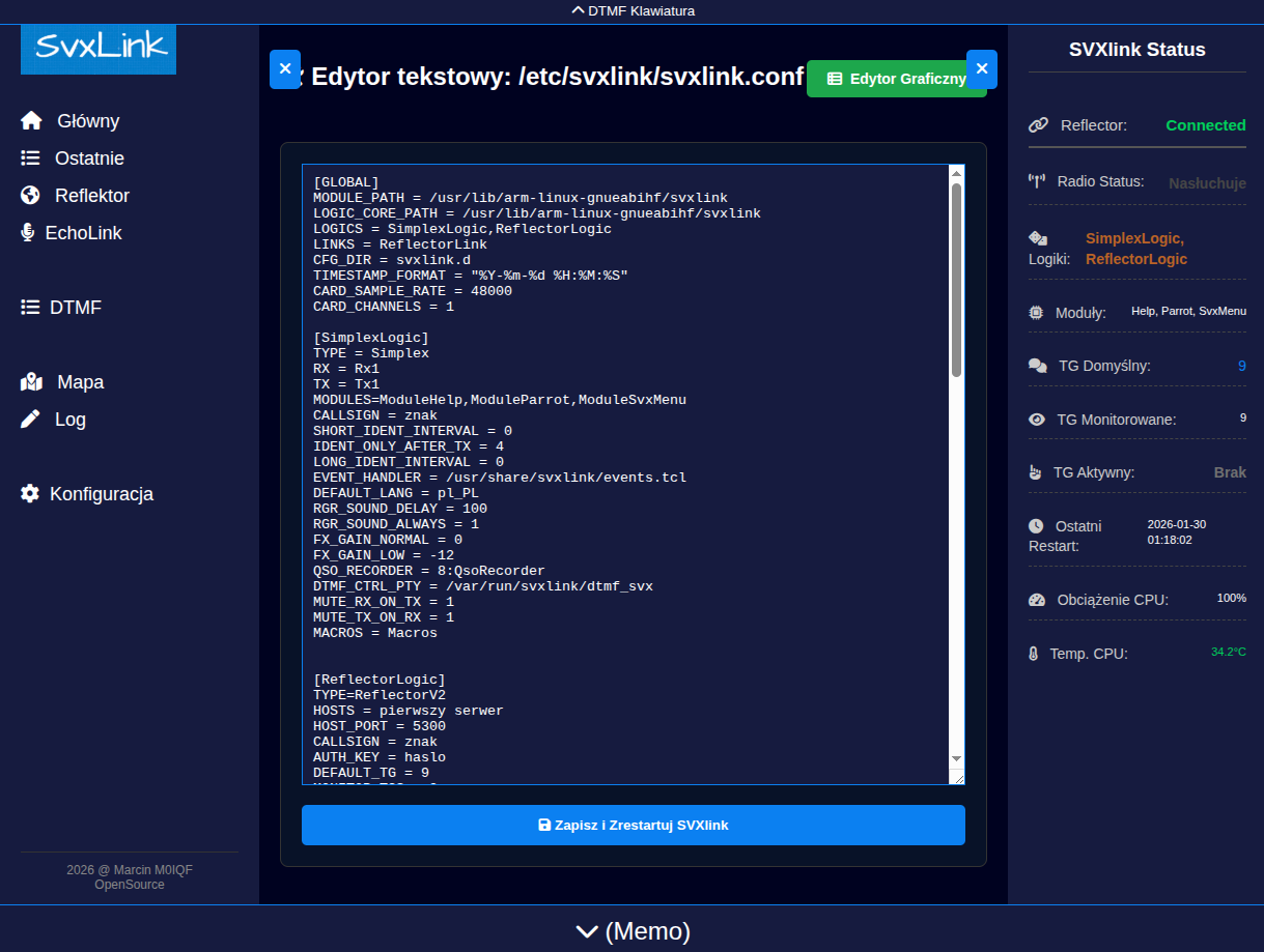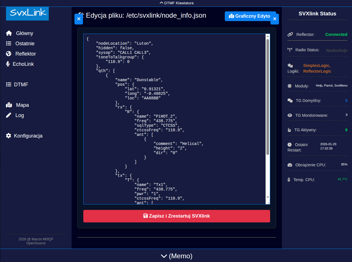 Mamy także do dyspozycji tekstowy edytor pliku node_info.json. Przypomnę że dane zawarte w tym pliku są przekazywane d oserwera SVXreflektor i nastepnie publikowane przez API. dane te pozwalają budować przykładowo mapę czy interfejs , kto nadaje i kilka innych.