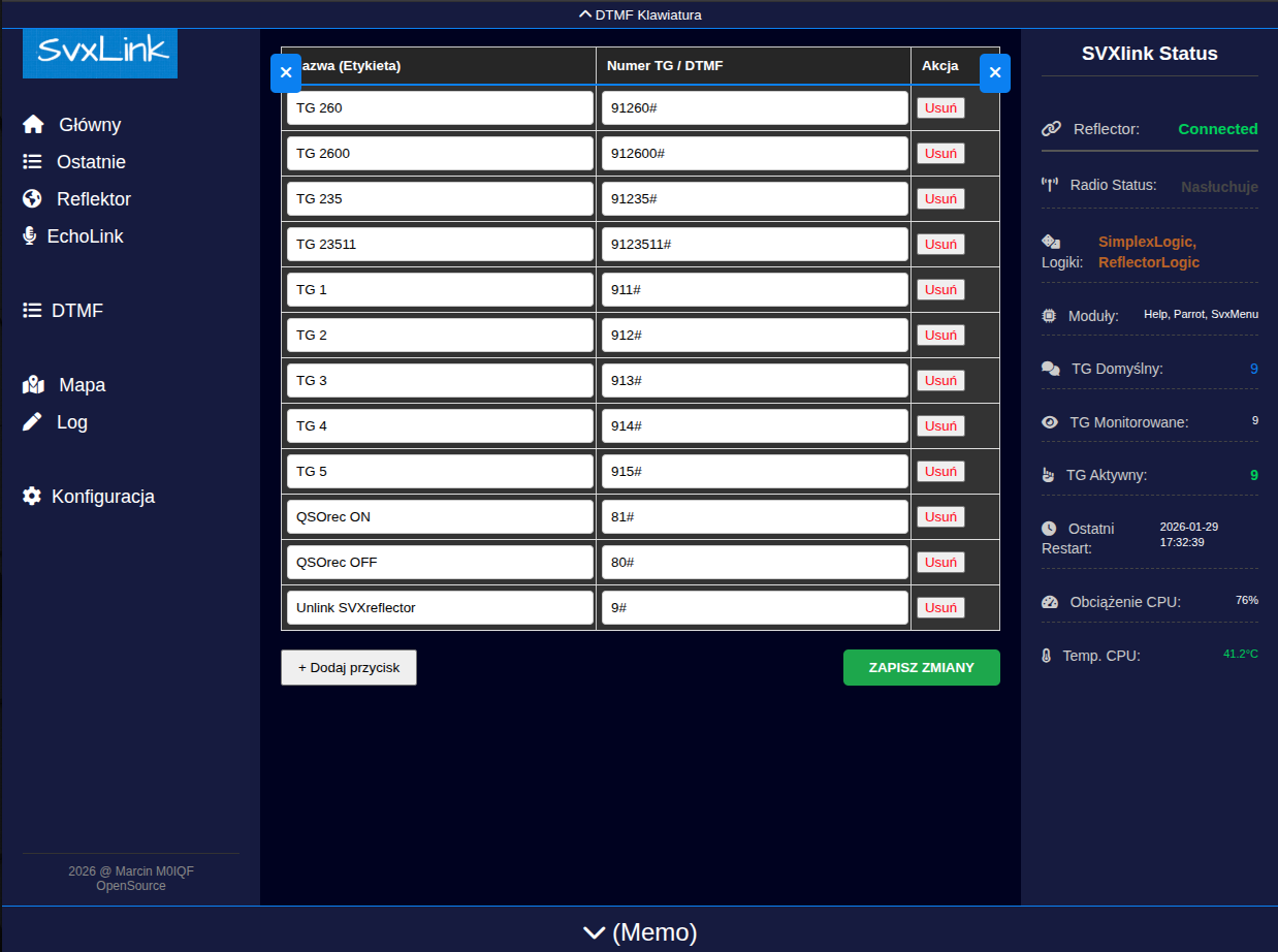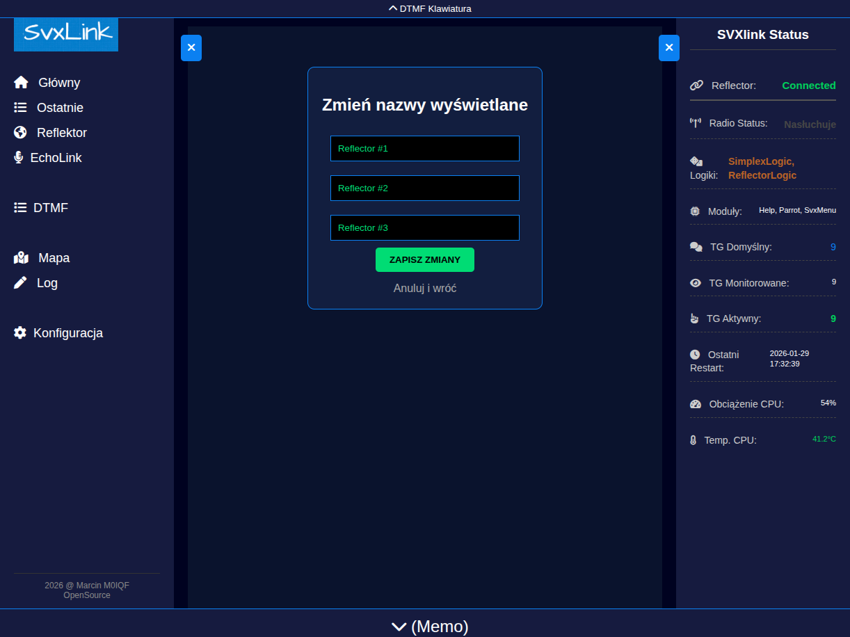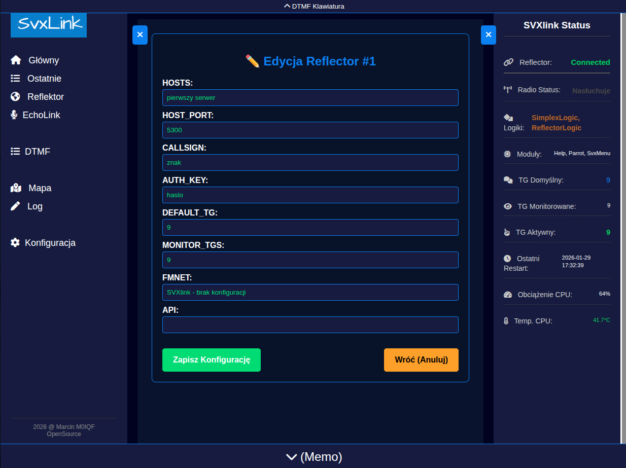 Nastepnie po dokonaniu edycji możemy wcisnąć przycisk Reflector #2 i cieszyć się tym że skrypt podmieni dane logowania do serwera w pliku svxlink.conf a następnie nastapi restart svxlink.
