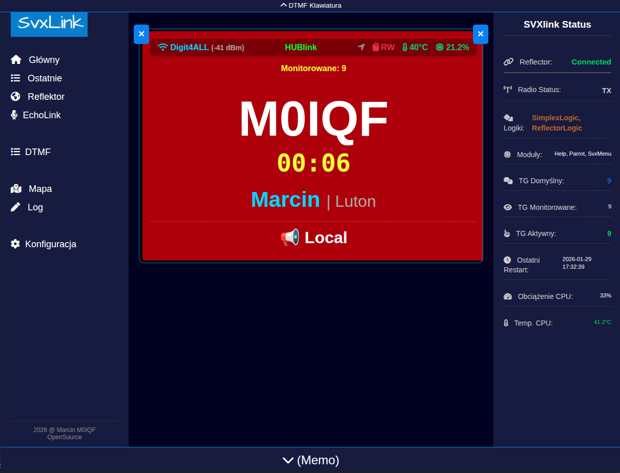 Łączność: Współpraca z wieloma reflektorami SvxLink (m.in. HUBlink, MiniLink, FM_UK) oraz możliwość przełączania na sieć pomiędzy sieciami SVXlink i AllStarLink, zależnie od potrzeb współpracy.