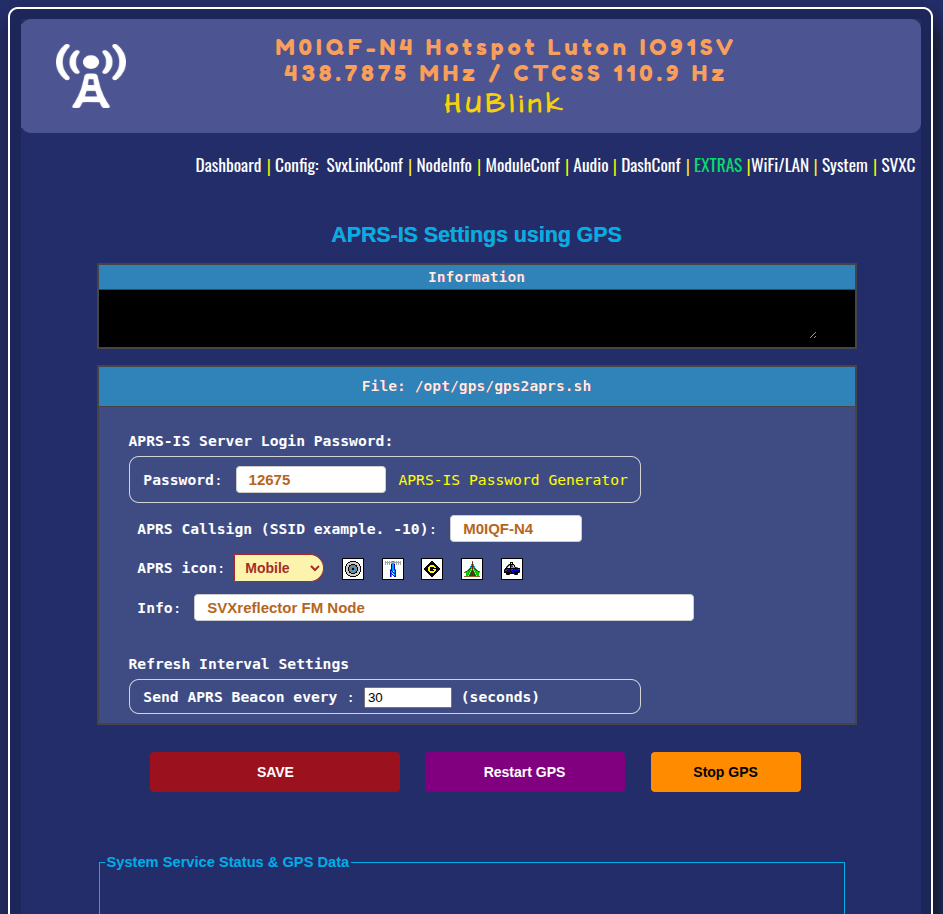Jest to moja wariacja nad Waldka SP2ONG skryptem obecnym w EXTRAS pod przyciskiem APRS. Tylko tu dane sa nie statyczne i bazyją na GPS, co pozwala na umieszczenie znacznika na APRSIS na zasadach tracker. Jak widac można ustawić podstawowe informacje, ale mam apetyt dodać coś w stylu telemetrii lub aktywnego komentarza który by informował o aktywnej grupie TG ( chyba coś takiego pamiętam z projektu HBLink, czy innego DMR )