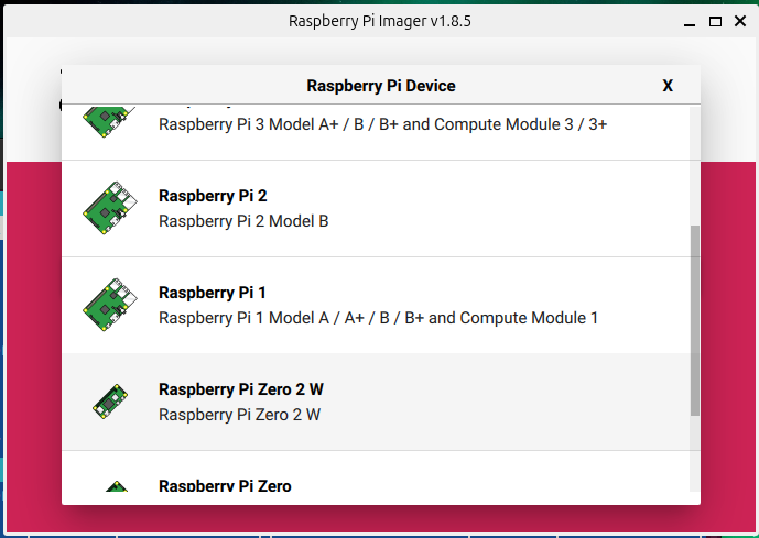 Wkładamy nasza kartę SD do komputera i po uruchmieniu programu pierwsze pole jakie mamy do wyboru rodzaj urządzenia, w moim przypadku RaspberryPi Zero 2W