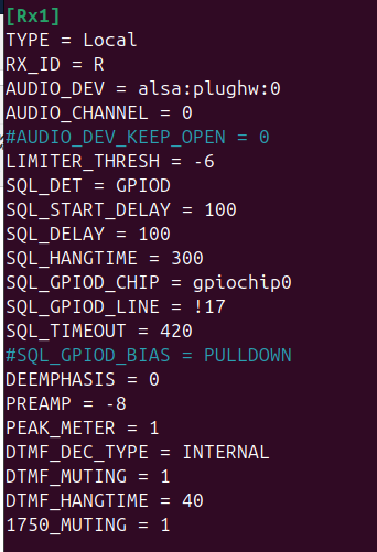Kolejnym ważym dla nas parametrem jest SQL_GPIOD_LINE gdzie podajemu numer GPIO które ma wykrywać sygnał z radia że blokada squelch została orwarta i radi oodbiera sygnał. Dodanie znaku ! przed numerem odwraca polaryzację ( stan niski lub wysoki to aktywacja ) Stany na GPIO to napięcie do 3.3V lub poniżej 1.4V ( nie pamietam dokładnie ale chyba już powyżej 1.4V raspberry wykrywa jako stan wysoki.