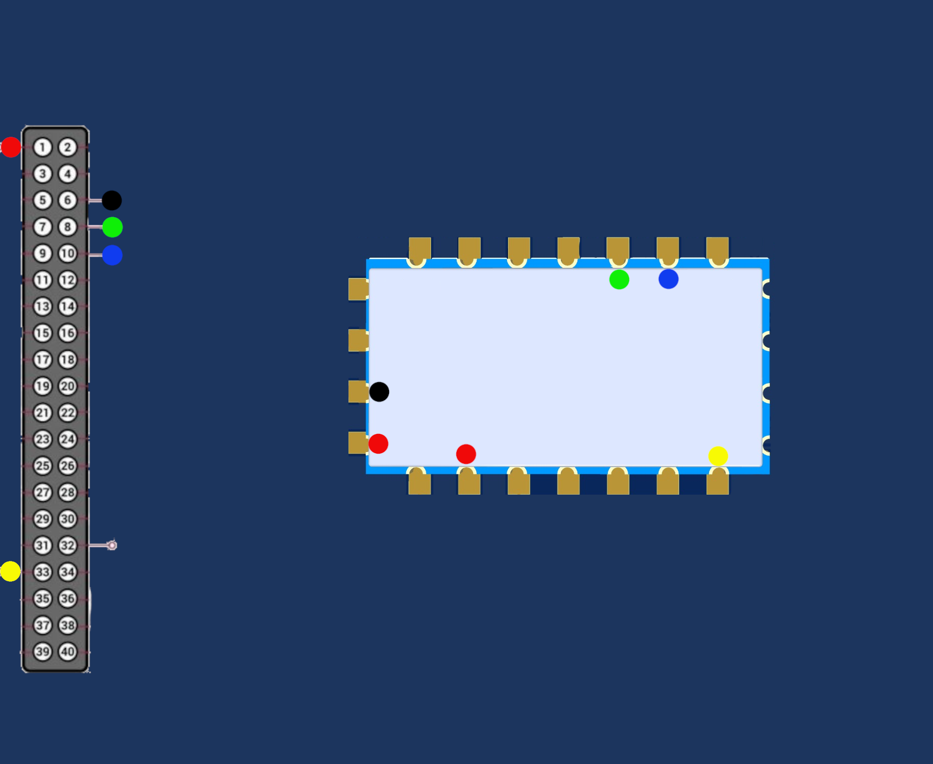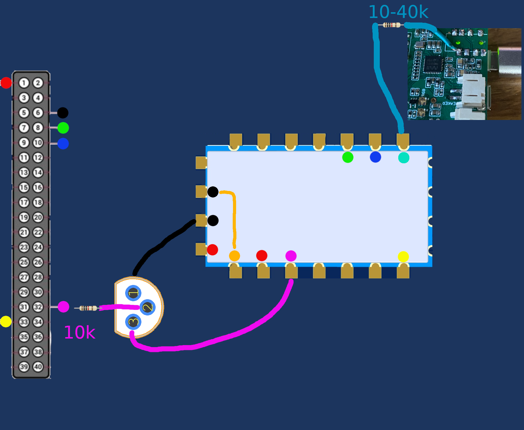 Na rysunku są pokazane piny zasilania ( czarny i czerwony ) oraz piny do programowania ( zielony i niebieski ) oraz żółty prowadzący do GPIO13 jako sygnalizacja że blokada szumów jest otwarta ( SQL OPEN )
